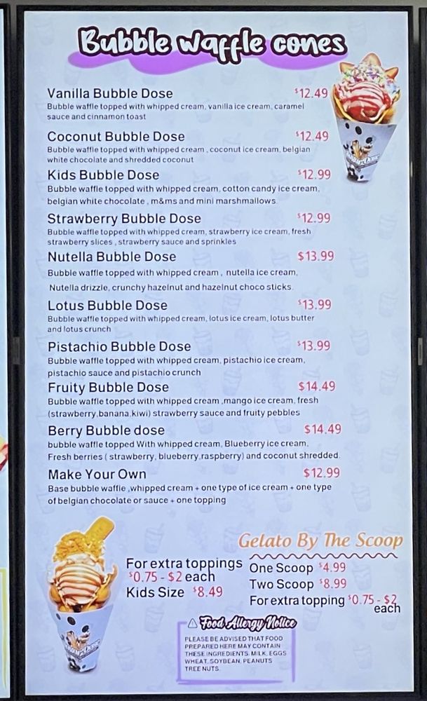 Base bubble waffle, whipped cream and 1 type of ice cream and 1 type of Belgian chocolate or sauce and 1 topping.