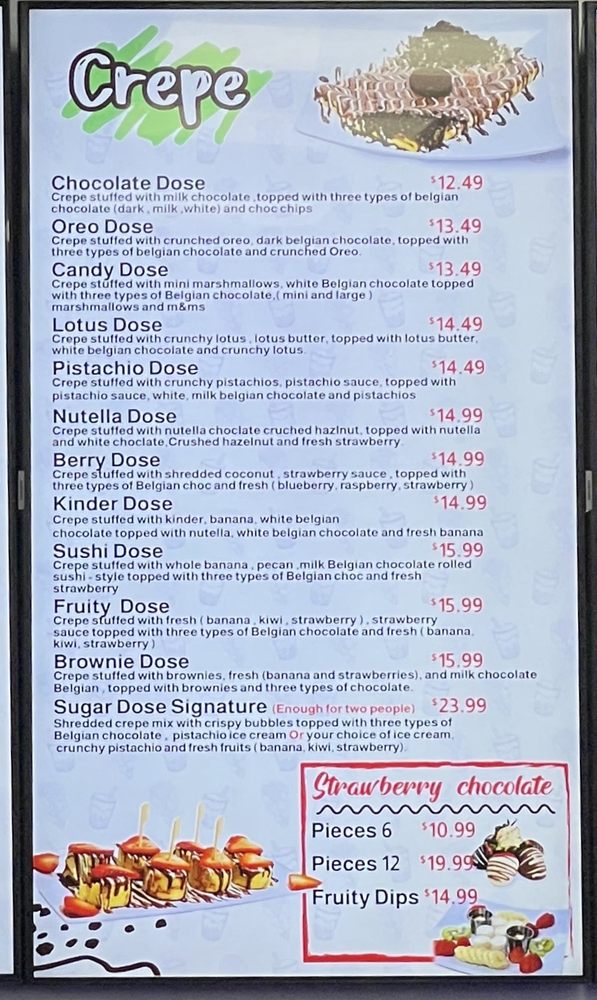 Sugar Dose, located in Lombard, IL, offers a delectable menu featuring waffles, desserts, and bubble tea. The cozy ambiance, efficient service, and innovative dishes make it a must-visit spot for any dessert enthusiast. The Lotus Bubble Dose waffle, bursting with lotus flavors, and the fruity Bubble Dose waffle, brimming with fresh fruits, are standout options. The Sugar Dose Signature Crepe, loaded with Belgian chocolate and your choice of ice cream, is a heavenly treat. Customer reviews highlight the quality and freshness of the desserts, with favorites like the pistachio kunafah bar and lotus kunafah cup standing out. Despite the slightly higher prices, the unique flavors and top-notch quality make Sugar Dose worth a visit for a delightful indulgence. With offerings like the Nutella Bubble Dose and the strawberry chocolate pieces, Sugar Dose promises a memorable dessert experience.